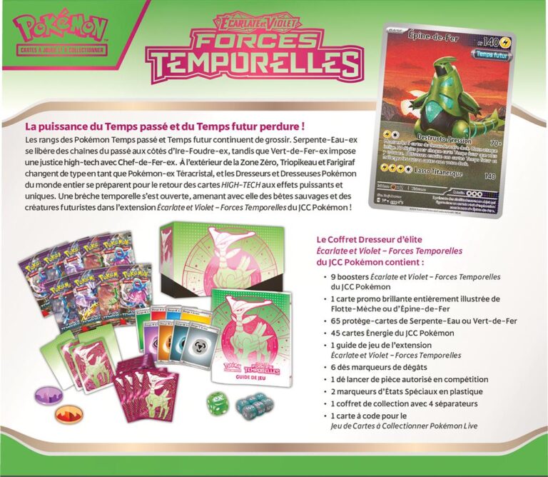Plongez dans l’épopée Pokémon avec l’ETB EV05 Forces Temporelles. Chaque booster de ce coffret renferme une part de mystère et d’excitation, offrant la possibilité de découvrir des cartes rares et puissantes pour étoffer votre collection.